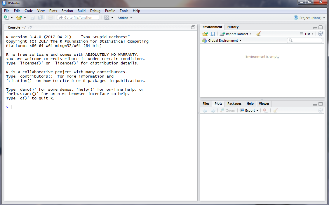 There are three panels showing. However, you need the forth one, which is the editor window. Click the green-plus icon on left-top corner, and select R Script. You write all your code in this editor window, and remember to save it!